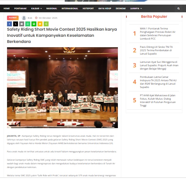 Safety Riding Short Movie Contest 2025 Hasilkan karya Inovatif untuk Kampanyekan Keselamatan Berkendara by masmul 4 Oktober 2025 in Silahkan kunjungi https://www.suarapemredkalbar.com/read/potret/04102025/safety-riding-short-movie-contest-2025-hasilkan-karya-inovatif-untuk-kampanyekan-keselamatan-berkendara. You Might Like Regional Public Launching New ADV160 The SUV Pride Grand Launching New PCX 160 Truly Exceptional! Tetap hati-hati ya bro sist berkendara saat hujan.