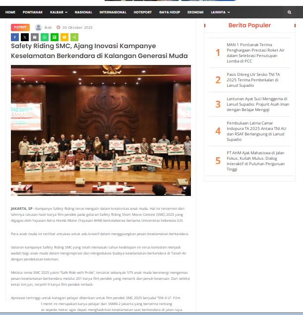 Safety Riding SMC, Ajang Inovasi Kampanye Keselamatan Berkendara di Kalangan Generasi Muda by masmul 5 Oktober 2025 in Silahkan kunjungi https://www.suarapemredkalbar.com/read/potret/05102025/safety-riding-smc-ajang-inovasi-kampanye-keselamatan-berkendara-di-kalangan-generasi-muda. You Might Like Regional Public Launching New ADV160 The SUV Pride Grand Launching New PCX 160 Truly Exceptional! Tetap hati-hati ya bro sist berkendara saat hujan.