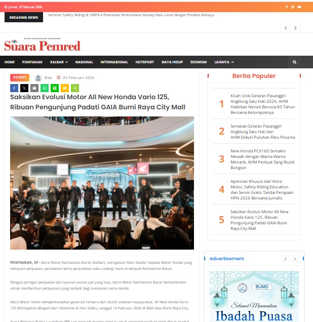 Saksikan Evolusi Motor All New Honda Vario 125, Ribuan Pengunjung Padati GAIA Bumi Raya City Mall by masmul 25 Februari 2026 in Silahkan kunjungi https://www.suarapemredkalbar.com/read/potret/25022026/saksikan-evolusi-motor-all-new-honda-vario-125-ribuan-pengunjung-padati-gaia-bumi-raya-city-mall. You Might Like Regional Public Launching New ADV160 The SUV Pride Grand Launching New PCX 160 Truly Exceptional! Tetap hati-hati ya bro sist berkendara saat hujan.