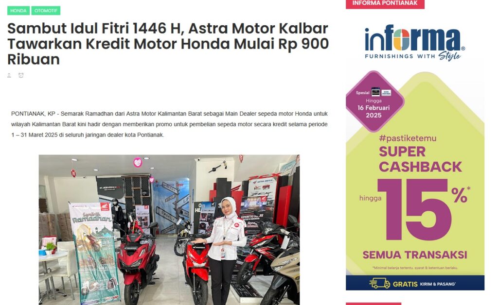 Sambut Idul Fitri 1446 H, Astra Motor Kalbar Tawarkan Kredit Motor Honda Mulai Rp 900 Ribuan by Muhammad Arif 27 Maret 2025 in Silahkan kunjungi https://www.kapuaspost.web.id/2025/03/sambut-idul-fitri-1446-h-astra-motor.html. Tags: astra Astra Motor kalbar Astra Motor Pontianak astramotor honda kalbar pontianak sepeda motor You Might Like Regional Public Launching New ADV160 The SUV Pride Grand Launching New PCX 160 Truly Exceptional! Tetap hati-hati ya bro sist berkendara saat hujan.