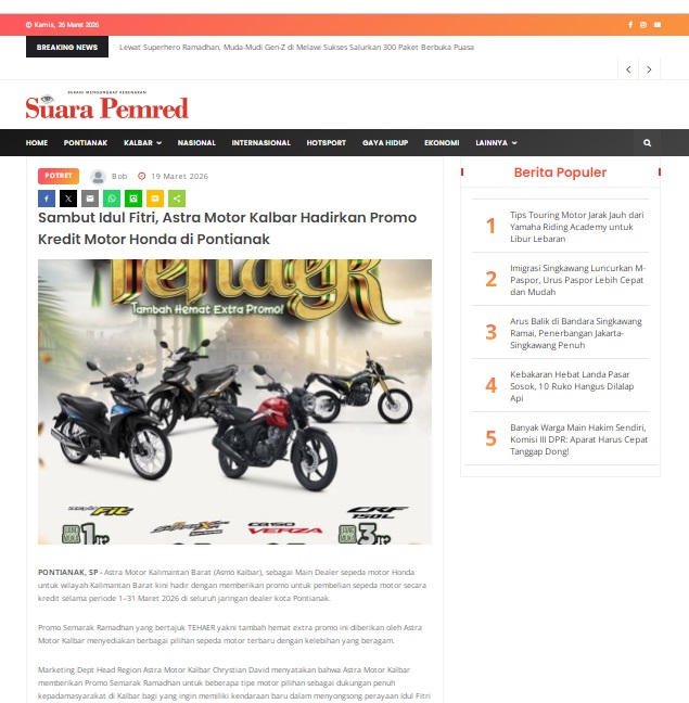 Sambut Idul Fitri, Astra Motor Kalbar Hadirkan Promo Kredit Motor Honda di Pontianak by masmul 19 Maret 2026 in Silahkan kunjungi https://www.suarapemredkalbar.com/read/potret/19032026/sambut-idul-fitri-astra-motor-kalbar-hadirkan-promo-kredit-motor-honda-di-pontianak. You Might Like Regional Public Launching New ADV160 The SUV Pride Grand Launching New PCX 160 Truly Exceptional! Tetap hati-hati ya bro sist berkendara saat hujan.