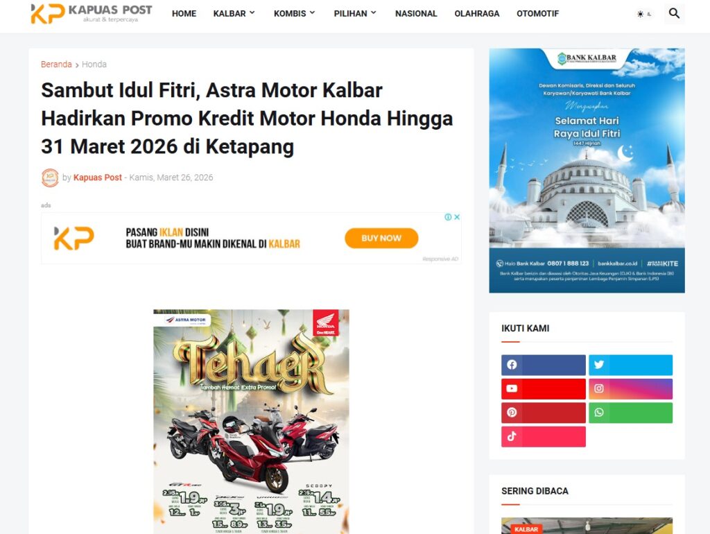Sambut Idul Fitri, Astra Motor Kalbar Hadirkan Promo Kredit Motor Honda Hingga 31 Maret 2026 di Ketapang by Muhammad Arif 26 Maret 2026 in Silahkan kunjungi https://www.kapuaspost.web.id/2026/03/sambut-idul-fitri-astra-motor-kalbar.html. Tags: astra Astra Motor kalbar Astra Motor Pontianak astramotor honda kalbar pontianak sepeda motor You Might Like Regional Public Launching New ADV160 The SUV Pride Grand Launching New PCX 160 Truly Exceptional! Tetap hati-hati ya bro sist berkendara saat hujan.