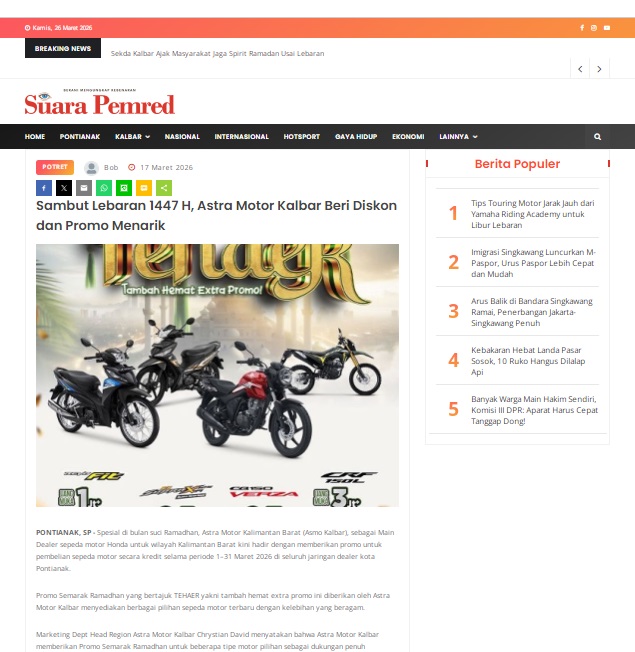 Sambut Lebaran 1447 H, Astra Motor Kalbar Beri Diskon dan Promo Menarik by masmul 17 Maret 2026 in Silahkan kunjungi https://www.suarapemredkalbar.com/read/potret/17032026/sambut-lebaran-1447-h-astra-motor-kalbar-beri-diskon-dan-promo-menarik. You Might Like Regional Public Launching New ADV160 The SUV Pride Grand Launching New PCX 160 Truly Exceptional! Tetap hati-hati ya bro sist berkendara saat hujan.