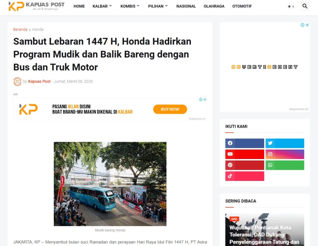 Sambut Lebaran 1447 H, Honda Hadirkan Program Mudik dan Balik Bareng dengan Bus dan Truk Motor by Muhammad Arif 6 Maret 2026 in Silahkan kunjungi https://www.kapuaspost.web.id/2026/03/sambut-lebaran-1447-h-honda-hadirkan.html. Tags: astra Astra Motor kalbar Astra Motor Pontianak astramotor honda kalbar pontianak sepeda motor You Might Like Regional Public Launching New ADV160 The SUV Pride Grand Launching New PCX 160 Truly Exceptional! Tetap hati-hati ya bro sist berkendara saat hujan.