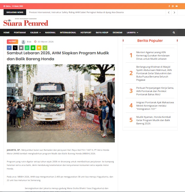 Sambut Lebaran 2026, AHM Siapkan Program Mudik dan Balik Bareng Honda by masmul 3 Maret 2026 in Silahkan kunjungi https://www.suarapemredkalbar.com/read/potret/03032026/sambut-lebaran-2026-ahm-siapkan-program-mudik-dan-balik-bareng-honda. You Might Like Regional Public Launching New ADV160 The SUV Pride Grand Launching New PCX 160 Truly Exceptional! Tetap hati-hati ya bro sist berkendara saat hujan.
