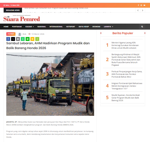 Sambut Lebaran, AHM Hadirkan Program Mudik dan Balik Bareng Honda 2026 by masmul 10 Maret 2026 in Silahkan kunjungi https://www.suarapemredkalbar.com/read/potret/10032026/sambut-lebaran-ahm-hadirkan-program-mudik-dan-balik-bareng-honda-2026. You Might Like Regional Public Launching New ADV160 The SUV Pride Grand Launching New PCX 160 Truly Exceptional! Tetap hati-hati ya bro sist berkendara saat hujan.