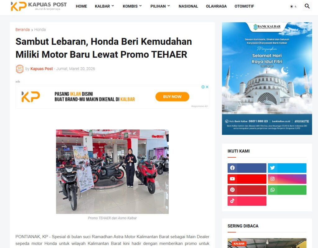 Sambut Lebaran, Honda Beri Kemudahan Miliki Motor Baru Lewat Promo TEHAER by Muhammad Arif 20 Maret 2026 in Silahkan kunjungi https://www.kapuaspost.web.id/2026/03/sambut-lebaran-honda-beri-kemudahan.html. Tags: astra Astra Motor kalbar Astra Motor Pontianak astramotor honda kalbar pontianak sepeda motor You Might Like Regional Public Launching New ADV160 The SUV Pride Grand Launching New PCX 160 Truly Exceptional! Tetap hati-hati ya bro sist berkendara saat hujan.