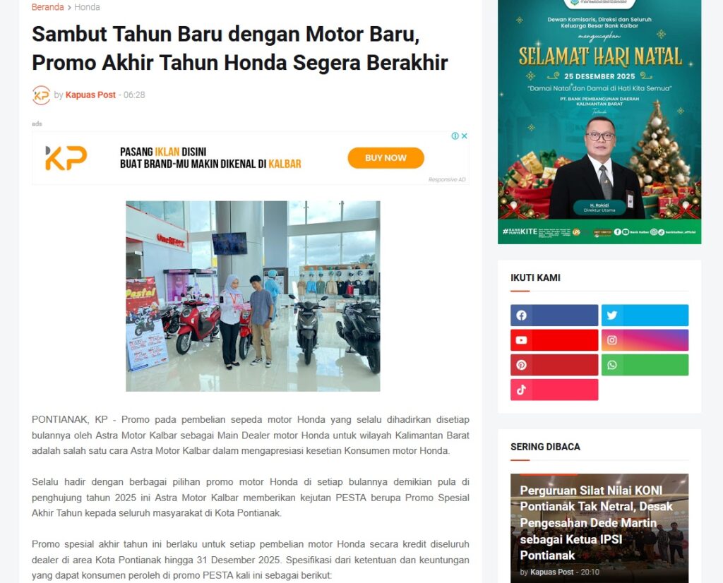 Sambut Tahun Baru dengan Motor Baru, Promo Akhir Tahun Honda Segera Berakhir by Muhammad Arif 25 Desember 2025 in Silahkan kunjungi https://www.kapuaspost.web.id/2025/12/sambut-tahun-baru-dengan-motor-baru.html. Tags: astra Astra Motor kalbar Astra Motor Pontianak astramotor honda kalbar pontianak sepeda motor You Might Like Regional Public Launching New ADV160 The SUV Pride Grand Launching New PCX 160 Truly Exceptional! Tetap hati-hati ya bro sist berkendara saat hujan.
