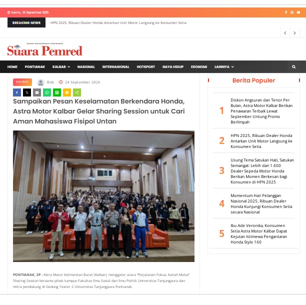 Sampaikan Pesan Keselamatan Berkendara Honda, Astra Motor Kalbar Gelar Sharing Session untuk Cari Aman Mahasiswa Fisipol Untan by masmul 24 September 2025 in Silahkan kunjungi https://www.suarapemredkalbar.com/read/potret/24092025/sampaikan-pesan-keselamatan-berkendara-honda-astra-motor-kalbar-gelar-sharing-session-untuk-cari-aman-mahasiswa-fisipol-untan. You Might Like Regional Public Launching New ADV160 The SUV Pride Grand Launching New PCX 160 Truly Exceptional! Tetap hati-hati ya bro sist berkendara saat hujan.