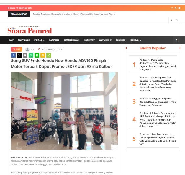 Sang SUV Pride Honda New Honda ADV160 Pimpin Motor Terbaik Dapat Promo JEDER dari ASmo Kalbar by masmul 9 November 2025 in Silahkan kunjungi https://www.suarapemredkalbar.com/read/potret/09112025/sang-suv-pride-honda-new-honda-adv160-pimpin-motor-terbaik-dapat-promo-jeder-dari-asmo-kalbar. You Might Like Regional Public Launching New ADV160 The SUV Pride Grand Launching New PCX 160 Truly Exceptional! Tetap hati-hati ya bro sist berkendara saat hujan.