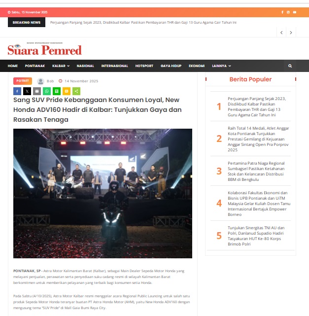 Sang SUV Pride Kebanggaan Konsumen Loyal, New Honda ADV160 Hadir di Kalbar: Tunjukkan Gaya dan Rasakan Tenaga by masmul 14 November 2025 in Silahkan kunjungi https://www.suarapemredkalbar.com/read/potret/14112025/sang-suv-pride-kebanggaan-konsumen-loyal-new-honda-adv160-hadir-di-kalbar-tunjukkan-gaya-dan-rasakan-tenaga. You Might Like Regional Public Launching New ADV160 The SUV Pride Grand Launching New PCX 160 Truly Exceptional! Tetap hati-hati ya bro sist berkendara saat hujan.