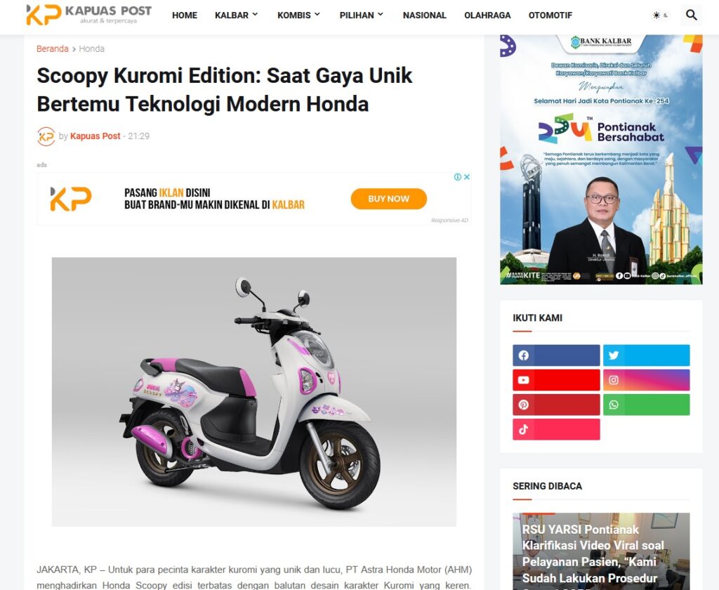 Scoopy Kuromi Edition: Saat Gaya Unik Bertemu Teknologi Modern Honda by Muhammad Arif 15 Oktober 2025 in Silahkan kunjungi https://www.kapuaspost.web.id/2025/10/scoopy-kuromi-edition-saat-gaya-unik.html. Tags: astra Astra Motor kalbar Astra Motor Pontianak astramotor honda kalbar pontianak sepeda motor You Might Like Regional Public Launching New ADV160 The SUV Pride Grand Launching New PCX 160 Truly Exceptional! Tetap hati-hati ya bro sist berkendara saat hujan.
