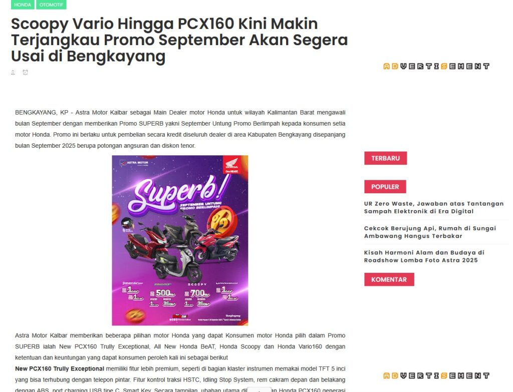 Scoopy Vario Hingga PCX160 Kini Makin Terjangkau Promo September Akan Segera Usai di Bengkayang by Muhammad Arif 23 September 2025 in Silahkan kunjungi https://www.kapuaspost.web.id/2025/09/scoopy-vario-hingga-pcx160-kini-makin.html. Tags: astra Astra Motor kalbar Astra Motor Pontianak astramotor honda kalbar pontianak sepeda motor You Might Like Regional Public Launching New ADV160 The SUV Pride Grand Launching New PCX 160 Truly Exceptional! Tetap hati-hati ya bro sist berkendara saat hujan.