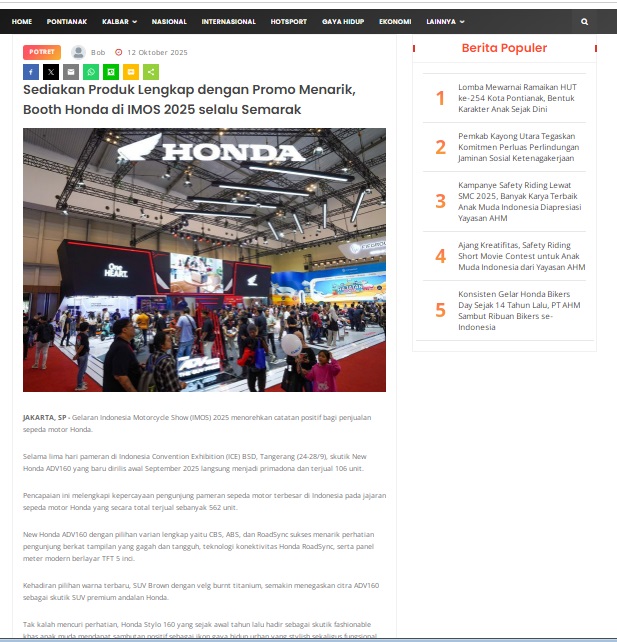Sediakan Produk Lengkap dengan Promo Menarik, Booth Honda di IMOS 2025 selalu Semarak by masmul 12 Oktober 2025 in Silahkan kunjungi https://www.suarapemredkalbar.com/read/potret/12102025/sediakan-produk-lengkap-dengan-promo-menarik-booth-honda-di-imos-2025-selalu-semarak. You Might Like Regional Public Launching New ADV160 The SUV Pride Grand Launching New PCX 160 Truly Exceptional! Tetap hati-hati ya bro sist berkendara saat hujan.