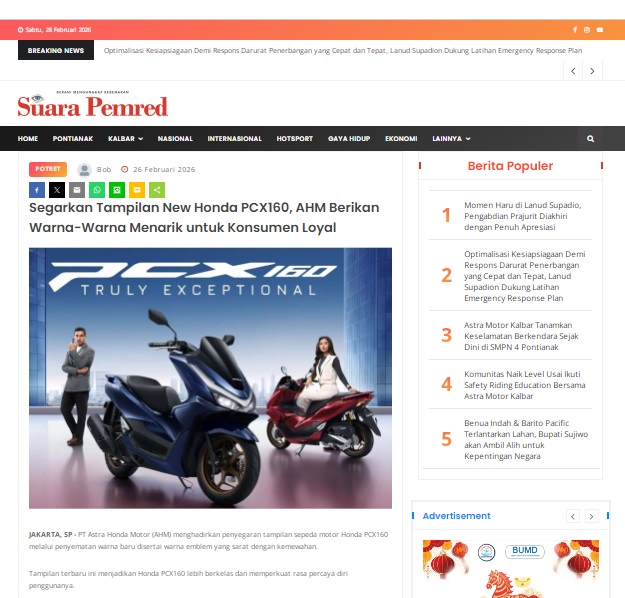 Segarkan Tampilan New Honda PCX160, AHM Berikan Warna-Warna Menarik untuk Konsumen Loyal by masmul 26 Februari 2026 in Silahkan kunjungi https://www.suarapemredkalbar.com/read/potret/26022026/segarkan-tampilan-new-honda-pcx160-ahm-berikan-warna-warna-menarik-untuk-konsumen-loyal. You Might Like Regional Public Launching New ADV160 The SUV Pride Grand Launching New PCX 160 Truly Exceptional! Tetap hati-hati ya bro sist berkendara saat hujan.