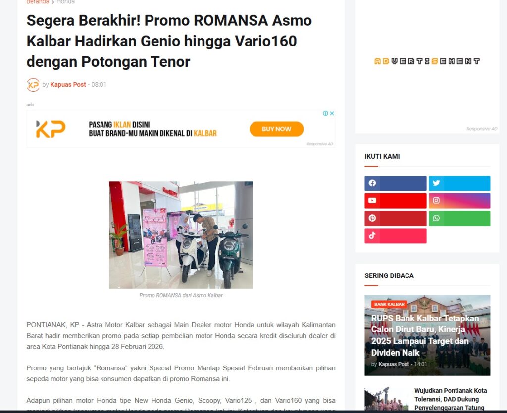 Segera Berakhir! Promo ROMANSA Asmo Kalbar Hadirkan Genio hingga Vario160 dengan Potongan Tenor by Muhammad Arif 24 Februari 2026 in Silahkan kunjungi https://www.kapuaspost.web.id/2026/02/segera-berakhir-promo-romansa-asmo.html. Tags: astra Astra Motor kalbar Astra Motor Pontianak astramotor honda kalbar pontianak sepeda motor You Might Like Regional Public Launching New ADV160 The SUV Pride Grand Launching New PCX 160 Truly Exceptional! Tetap hati-hati ya bro sist berkendara saat hujan.