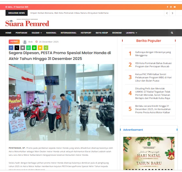 Segera Dipesan, PESTA Promo Spesial Motor Honda di Akhir Tahun Hingga 31 Desember 2025 by masmul 26 Desember 2025 in Silahkan kunjungi https://www.suarapemredkalbar.com/read/potret/26122025/segera-dipesan-pesta-promo-spesial-motor-honda-di-akhir-tahun-hingga-31-desember-2025. You Might Like Regional Public Launching New ADV160 The SUV Pride Grand Launching New PCX 160 Truly Exceptional! Tetap hati-hati ya bro sist berkendara saat hujan.