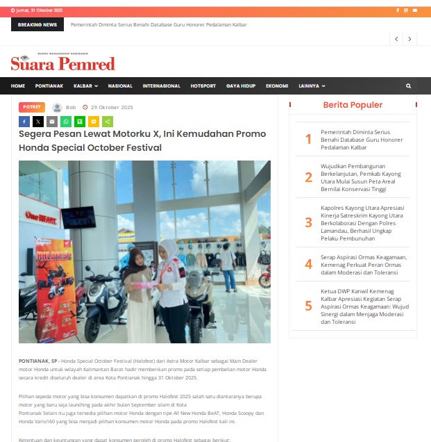 Segera Pesan Lewat Motorku X, Ini Kemudahan Promo Honda Special October Festival by masmul 29 Oktober 2025 in Silahkan kunjungi https://www.suarapemredkalbar.com/read/potret/29102025/segera-pesan-lewat-motorku-x-ini-kemudahan-promo-honda-special-october-festival. You Might Like Regional Public Launching New ADV160 The SUV Pride Grand Launching New PCX 160 Truly Exceptional! Tetap hati-hati ya bro sist berkendara saat hujan.
