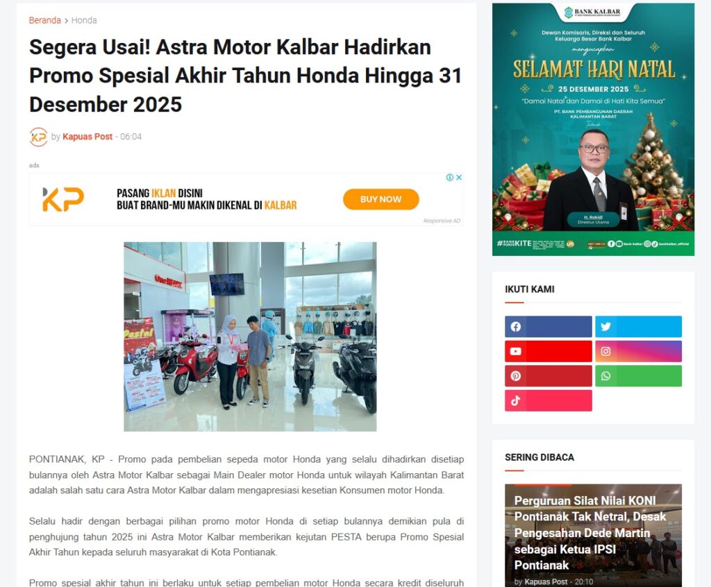 Segera Usai! Astra Motor Kalbar Hadirkan Promo Spesial Akhir Tahun Honda Hingga 31 Desember 2025 by Muhammad Arif 29 Desember 2025 in Silahkan kunjungi https://www.kapuaspost.web.id/2025/12/segera-usai-astra-motor-kalbar-hadirkan.html. Tags: astra Astra Motor kalbar Astra Motor Pontianak astramotor honda kalbar pontianak sepeda motor You Might Like Regional Public Launching New ADV160 The SUV Pride Grand Launching New PCX 160 Truly Exceptional! Tetap hati-hati ya bro sist berkendara saat hujan.