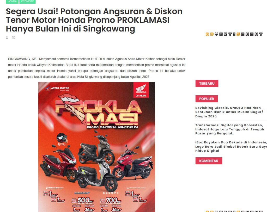 Segera Usai! Potongan Angsuran & Diskon Tenor Motor Honda Promo PROKLAMASI Hanya Bulan Ini di Singkawang by Muhammad Arif 28 Agustus 2025 in Silahkan kunjungi https://www.kapuaspost.web.id/2025/08/segera-usai-potongan-angsuran-diskon.html. Tags: astra Astra Motor kalbar Astra Motor Pontianak astramotor honda kalbar pontianak sepeda motor You Might Like Regional Public Launching New ADV160 The SUV Pride Grand Launching New PCX 160 Truly Exceptional! Tetap hati-hati ya bro sist berkendara saat hujan.