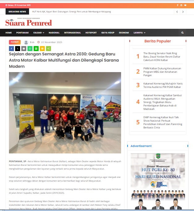 Sejalan dengan Semangat Astra 2030: Gedung Baru Astra Motor Kalbar Multifungsi dan Dilengkapi Sarana Modern by masmul 22 November 2025 in Silahkan kunjungi https://www.suarapemredkalbar.com/read/potret/22112025/sejalan-dengan-semangat-astra-2030-gedung-baru-astra-motor-kalbar-multifungsi-dan-dilengkapi-sarana-modern. You Might Like Regional Public Launching New ADV160 The SUV Pride Grand Launching New PCX 160 Truly Exceptional! Tetap hati-hati ya bro sist berkendara saat hujan.