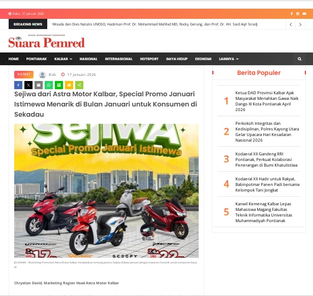 Sejiwa dari Astra Motor Kalbar, Special Promo Januari Istimewa Menarik di Bulan Januari untuk Konsumen di Sekadau by masmul 17 Januari 2026 in Silahkan kunjungi https://www.suarapemredkalbar.com/read/potret/17012026/sejiwa-dari-astra-motor-kalbar-special-promo-januari-istimewa-menarik-di-bulan-januari-untuk-konsumen-di-sekadau. You Might Like Regional Public Launching New ADV160 The SUV Pride Grand Launching New PCX 160 Truly Exceptional! Tetap hati-hati ya bro sist berkendara saat hujan.