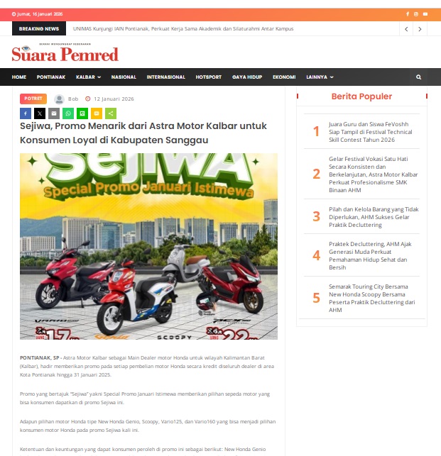 Sejiwa, Promo Menarik dari Astra Motor Kalbar untuk Konsumen Loyal di Kabupaten Sanggau by masmul 12 Januari 2026 in Silahkan kunjungi https://www.suarapemredkalbar.com/read/potret/12012026/sejiwa-promo-menarik-dari-astra-motor-kalbar-untuk-konsumen-loyal-di-kabupaten-sanggau. You Might Like Regional Public Launching New ADV160 The SUV Pride Grand Launching New PCX 160 Truly Exceptional! Tetap hati-hati ya bro sist berkendara saat hujan.