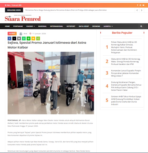 Sejiwa, Spesial Promo Januari Istimewa dari Astra Motor Kalbar by masmul 11 Januari 2026 in Silahkan kunjungi https://www.suarapemredkalbar.com/read/potret/11012026/sejiwa-spesial-promo-januari-istimewa-dari-astra-motor-kalbar. You Might Like Regional Public Launching New ADV160 The SUV Pride Grand Launching New PCX 160 Truly Exceptional! Tetap hati-hati ya bro sist berkendara saat hujan.