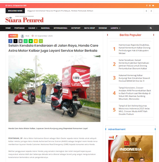 Selain Kendala Kendaraan di Jalan Raya, Honda Care Astra Motor Kalbar juga Layani Service Motor Berkala by masmul 3 September 2025 in Silahkan kunjungi https://www.suarapemredkalbar.com/read/potret/03092025/selain-kendala-kendaraan-di-jalan-raya-honda-care-astra-motor-kalbar-juga-layani-service-motor-berkala. You Might Like Regional Public Launching New ADV160 The SUV Pride Grand Launching New PCX 160 Truly Exceptional! Tetap hati-hati ya bro sist berkendara saat hujan.