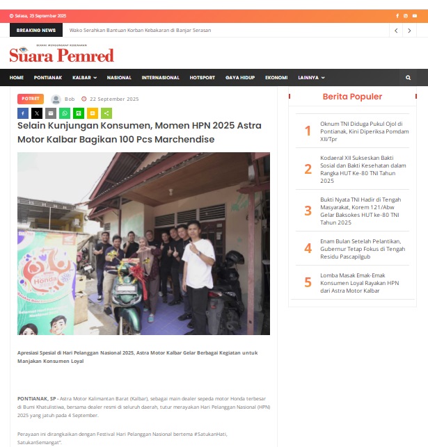 Selain Kunjungan Konsumen, Momen HPN 2025 Astra Motor Kalbar Bagikan 100 Pcs Marchendise by masmul 22 September 2025 in Silahkan kunjungi https://www.suarapemredkalbar.com/read/potret/22092025/selain-kunjungan-konsumen-momen-hpn-2025-astra-motor-kalbar-bagikan-100-pcs-marchendise. You Might Like Regional Public Launching New ADV160 The SUV Pride Grand Launching New PCX 160 Truly Exceptional! Tetap hati-hati ya bro sist berkendara saat hujan.