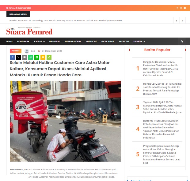 Selain Melalui Hotline Customer Care Astra Motor Kalbar, Konsumen Dapat Akses Melalui Aplikasi Motorku X untuk Pesan Honda Care by masmul 24 Desember 2025 in Silahkan kunjungi https://www.suarapemredkalbar.com/read/potret/24122025/selain-melalui-hotline-customer-care-astra-motor-kalbar-konsumen-dapat-akses-melalui-aplikasi-motorku-x-untuk-pesan-honda-care. You Might Like Regional Public Launching New ADV160 The SUV Pride Grand Launching New PCX 160 Truly Exceptional! Tetap hati-hati ya bro sist berkendara saat hujan.