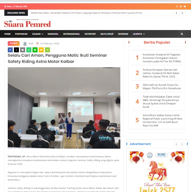 Selalu Cari Aman, Pengguna Matic Ikuti Seminar Safety Riding Astra Motor Kalbar by masmul 15 Februari 2026 in Silahkan kunjungi https://www.suarapemredkalbar.com/read/potret/15022026/selalu-cari-aman-pengguna-matic-ikuti-seminar-safety-riding-astra-motor-kalbar. You Might Like Regional Public Launching New ADV160 The SUV Pride Grand Launching New PCX 160 Truly Exceptional! Tetap hati-hati ya bro sist berkendara saat hujan.