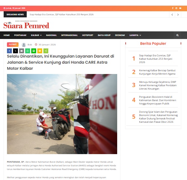 Selalu Dinantikan, Ini Keunggulan Layanan Darurat di Jalanan & Service Kunjung dari Honda CARE Astra Motor Kalbar by masmul 30 Januari 2026 in Silahkan kunjungi https://www.suarapemredkalbar.com/read/potret/30012026/selalu-dinantikan-ini-keunggulan-layanan-darurat-di-jalanan-service-kunjung-dari-honda-care-astra-motor-kalbar. You Might Like Regional Public Launching New ADV160 The SUV Pride Grand Launching New PCX 160 Truly Exceptional! Tetap hati-hati ya bro sist berkendara saat hujan.