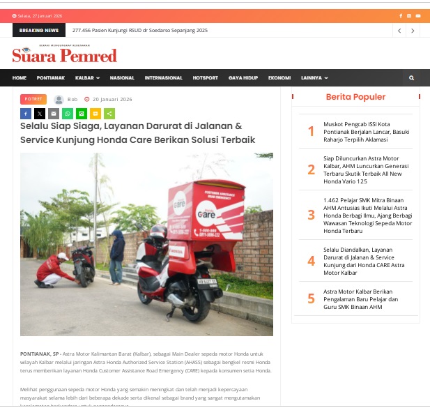 Selalu Siap Siaga, Layanan Darurat di Jalanan & Service Kunjung Honda Care Berikan Solusi Terbaik by masmul 20 Januari 2026 in Silahkan kunjungi https://www.suarapemredkalbar.com/read/potret/20012026/selalu-siap-siaga-layanan-darurat-di-jalanan-service-kunjung-honda-care-berikan-solusi-terbaik. You Might Like Regional Public Launching New ADV160 The SUV Pride Grand Launching New PCX 160 Truly Exceptional! Tetap hati-hati ya bro sist berkendara saat hujan.