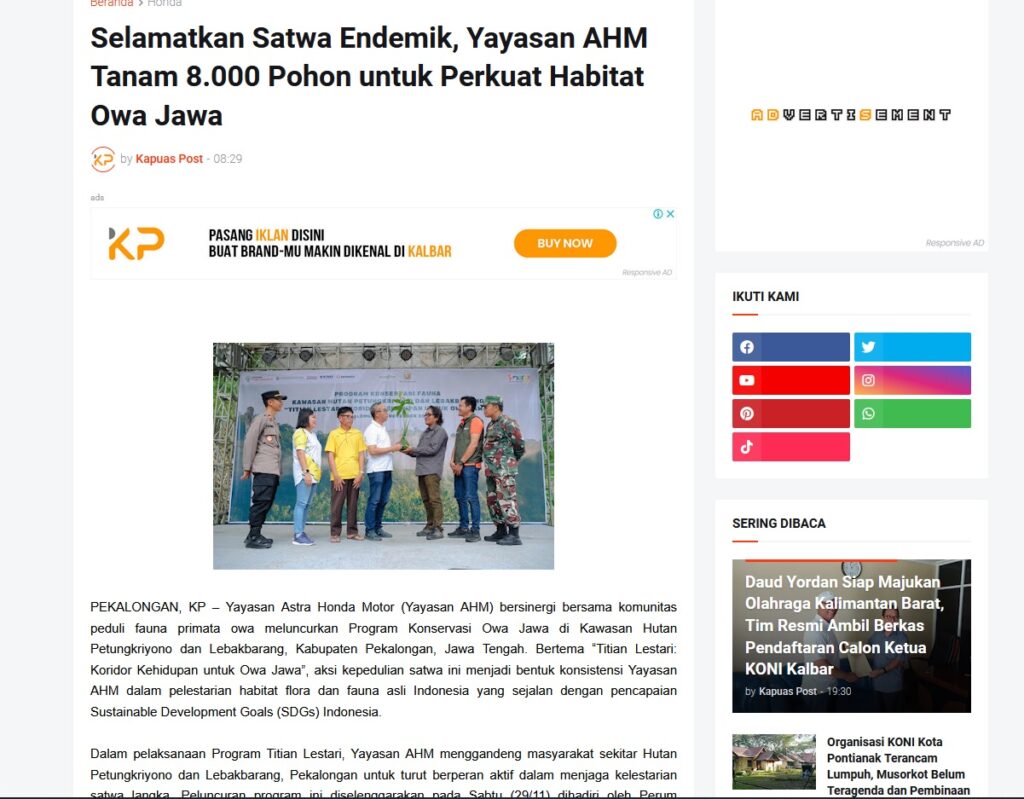 Selamatkan Satwa Endemik, Yayasan AHM Tanam 8.000 Pohon untuk Perkuat Habitat Owa Jawa by Muhammad Arif 3 Desember 2025 in Silahkan kunjungi https://www.kapuaspost.web.id/2025/12/selamatkan-satwa-endemik-yayasan-ahm.html. Tags: astra Astra Motor kalbar Astra Motor Pontianak astramotor honda kalbar pontianak sepeda motor You Might Like Regional Public Launching New ADV160 The SUV Pride Grand Launching New PCX 160 Truly Exceptional! Tetap hati-hati ya bro sist berkendara saat hujan.