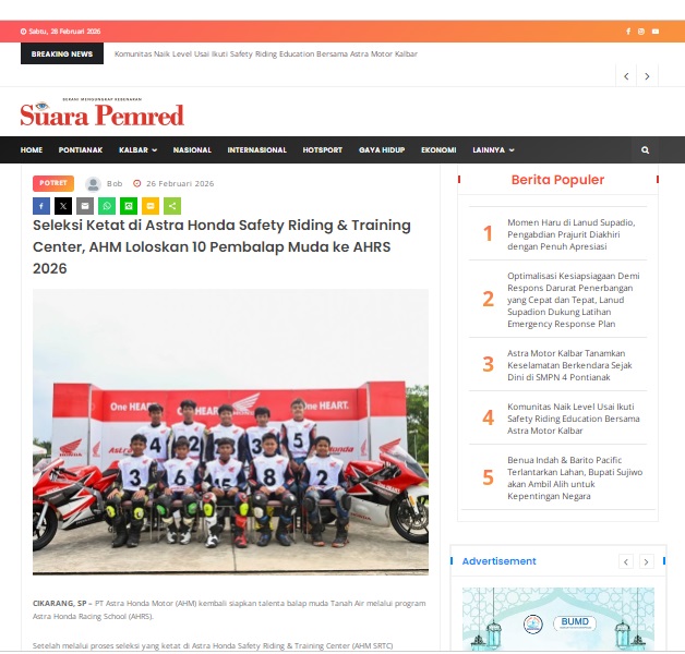 Seleksi Ketat di Astra Honda Safety Riding & Training Center, AHM Loloskan 10 Pembalap Muda ke AHRS 2026 by masmul 26 Februari 2026 in Silahkan kunjungi https://www.suarapemredkalbar.com/read/potret/26022026/seleksi-ketat-di-astra-honda-safety-riding-training-center-ahm-loloskan-10-pembalap-muda-ke-ahrs-2026. You Might Like Regional Public Launching New ADV160 The SUV Pride Grand Launching New PCX 160 Truly Exceptional! Tetap hati-hati ya bro sist berkendara saat hujan.
