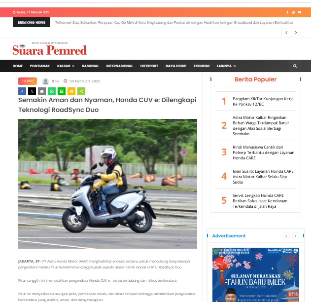Semakin Aman dan Nyaman, Honda CUV e: Dilengkapi Teknologi RoadSync Duo by masmul 9 Februari 2025 in Silahkan kunjungi https://www.suarapemredkalbar.com/read/potret/09022025/semakin-aman-dan-nyaman-honda-cuv-e-dilengkapi-teknologi-roadsync-duo. You Might Like Regional Public Launching New ADV160 The SUV Pride Grand Launching New PCX 160 Truly Exceptional! Tetap hati-hati ya bro sist berkendara saat hujan.