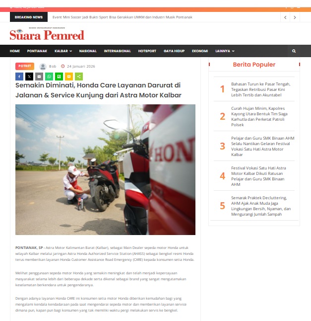 Semakin Diminati, Honda Care Layanan Darurat di Jalanan & Service Kunjung dari Astra Motor Kalbar by masmul 24 Januari 2026 in Silahkan kunjungi https://www.suarapemredkalbar.com/read/potret/24012026/semakin-diminati-honda-care-layanan-darurat-di-jalanan-service-kunjung-dari-astra-motor-kalbar. You Might Like Regional Public Launching New ADV160 The SUV Pride Grand Launching New PCX 160 Truly Exceptional! Tetap hati-hati ya bro sist berkendara saat hujan.