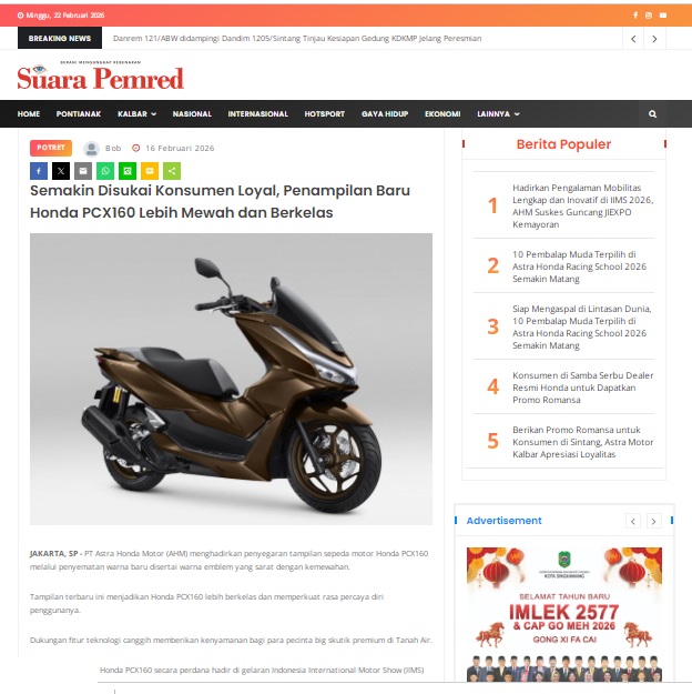 Semakin Disukai Konsumen Loyal, Penampilan Baru Honda PCX160 Lebih Mewah dan Berkelas by masmul 16 Februari 2026 in Silahkan kunjungi https://www.suarapemredkalbar.com/read/potret/16022026/semakin-disukai-konsumen-loyal-penampilan-baru-honda-pcx160-lebih-mewah-dan-berkelas. You Might Like Regional Public Launching New ADV160 The SUV Pride Grand Launching New PCX 160 Truly Exceptional! Tetap hati-hati ya bro sist berkendara saat hujan.