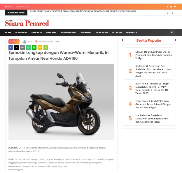 Semakin Lengkap dengan Warna-Warni Menarik, Ini Tampilan Anyar New Honda ADV160 by masmul 20 September 2025 in Silahkan kunjungi https://www.suarapemredkalbar.com/read/potret/20092025/semakin-lengkap-dengan-warna-warni-menarik-ini-tampilan-anyar-new-honda-adv160. You Might Like Regional Public Launching New ADV160 The SUV Pride Grand Launching New PCX 160 Truly Exceptional! Tetap hati-hati ya bro sist berkendara saat hujan.