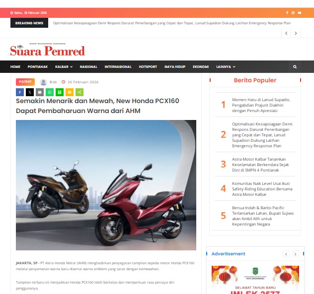 Semakin Menarik dan Mewah, New Honda PCX160 Dapat Pembaharuan Warna dari AHM by masmul 26 Februari 2026 in Silahkan kunjungi https://www.suarapemredkalbar.com/read/potret/26022026/semakin-menarik-dan-mewah-new-honda-pcx160-dapat-pembaharuan-warna-dari-ahm. You Might Like Regional Public Launching New ADV160 The SUV Pride Grand Launching New PCX 160 Truly Exceptional! Tetap hati-hati ya bro sist berkendara saat hujan.