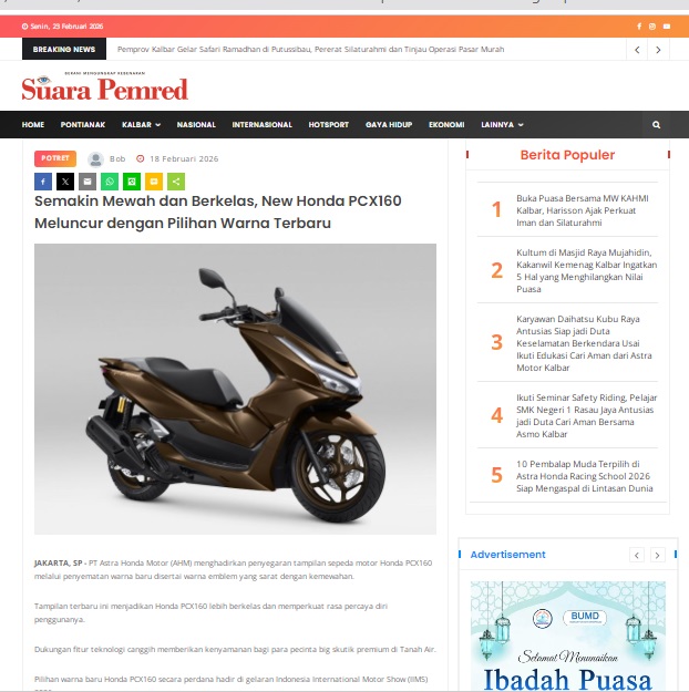 Semakin Mewah dan Berkelas, New Honda PCX160 Meluncur dengan Pilihan Warna Terbaru by masmul 18 Februari 2026 in Silahkan kunjungi https://www.suarapemredkalbar.com/read/potret/18022026/semakin-mewah-dan-berkelas-new-honda-pcx160-meluncur-dengan-pilihan-warna-terbaru. You Might Like Regional Public Launching New ADV160 The SUV Pride Grand Launching New PCX 160 Truly Exceptional! Tetap hati-hati ya bro sist berkendara saat hujan.