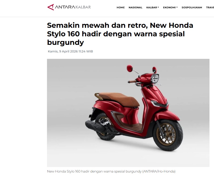 Semakin mewah dan retro, New Honda Stylo 160 hadir dengan warna spesial burgundy by Dedi 9 April 2026 in Silahkan kunjungi https://kalbar.antaranews.com/berita/697545/semakin-mewah-dan-retro-new-honda-stylo-160-hadir-dengan-warna-spesial-burgundy. You Might Like Regional Public Launching New ADV160 The SUV Pride Grand Launching New PCX 160 Truly Exceptional! Tetap hati-hati ya bro sist berkendara saat hujan.
