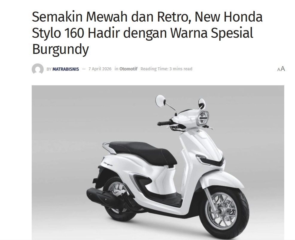 Semakin Mewah dan Retro, New Honda Stylo 160 Hadir dengan Warna Spesial Burgundy by Sri Yuliantiningsih 7 April 2026 in Silahkan kunjungi https://matrabisnis.id/2026/04/07/semakin-mewah-dan-retro-new-honda-stylo-160-hadir-dengan-warna-spesial-burgundy/. You Might Like Regional Public Launching New ADV160 The SUV Pride Grand Launching New PCX 160 Truly Exceptional! Tetap hati-hati ya bro sist berkendara saat hujan.
