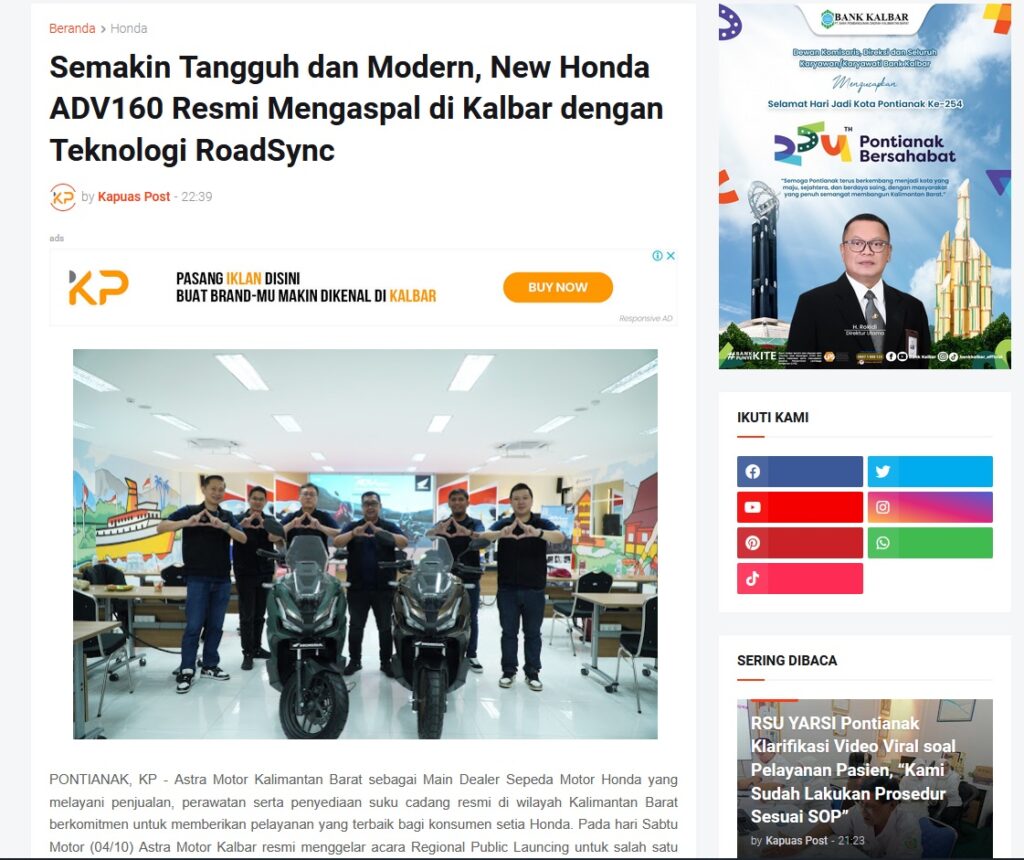Semakin Tangguh dan Modern, New Honda ADV160 Resmi Mengaspal di Kalbar dengan Teknologi RoadSync by Muhammad Arif 9 Oktober 2025 in Silahkan kunjungi https://www.kapuaspost.web.id/2025/10/semakin-tangguh-dan-modern-new-honda.html. Tags: astra Astra Motor kalbar Astra Motor Pontianak astramotor honda kalbar pontianak sepeda motor You Might Like Regional Public Launching New ADV160 The SUV Pride Grand Launching New PCX 160 Truly Exceptional! Tetap hati-hati ya bro sist berkendara saat hujan.