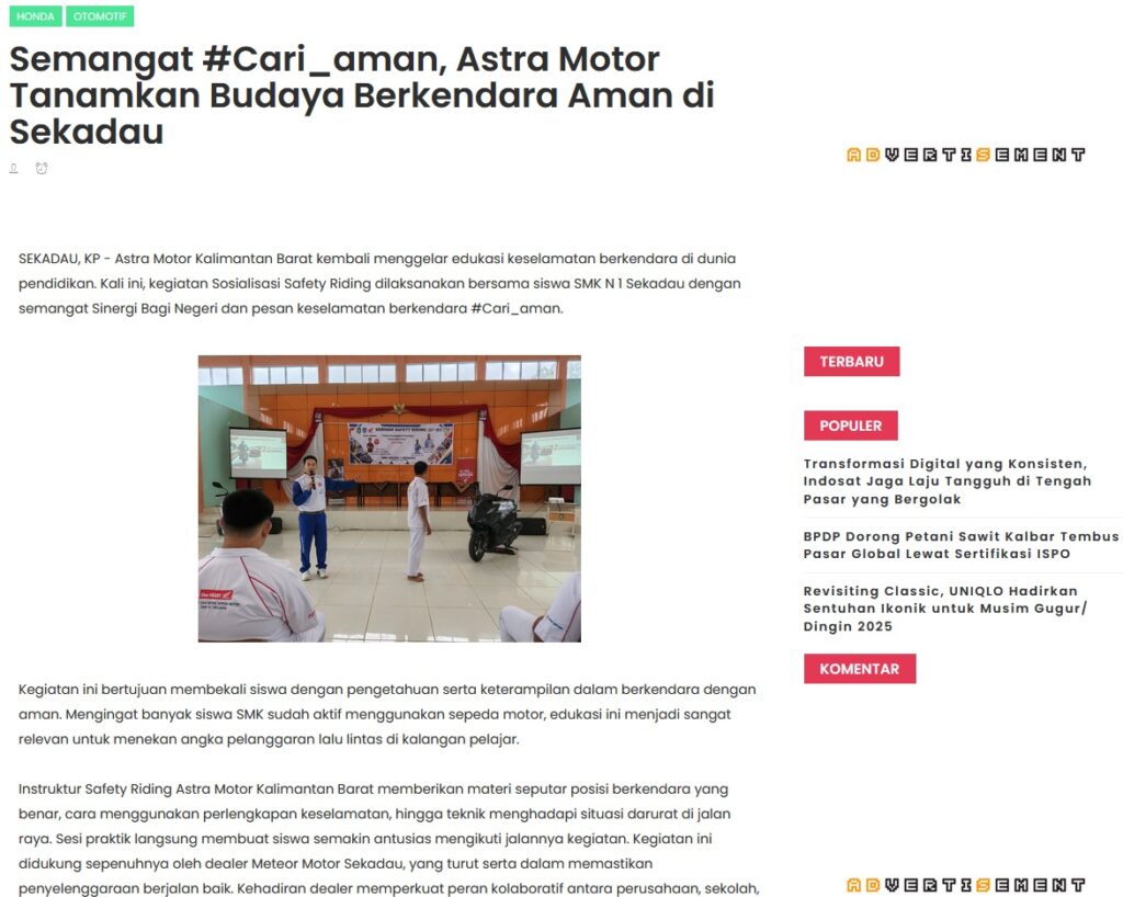 Semangat #Cari_aman, Astra Motor Tanamkan Budaya Berkendara Aman di Sekadau by Muhammad Arif 22 Agustus 2025 in Silahkan kunjungi https://www.kapuaspost.web.id/2025/08/semangat-cariaman-astra-motor-tanamkan.html. Tags: astra Astra Motor kalbar Astra Motor Pontianak astramotor honda kalbar pontianak sepeda motor You Might Like Regional Public Launching New ADV160 The SUV Pride Grand Launching New PCX 160 Truly Exceptional! Tetap hati-hati ya bro sist berkendara saat hujan.