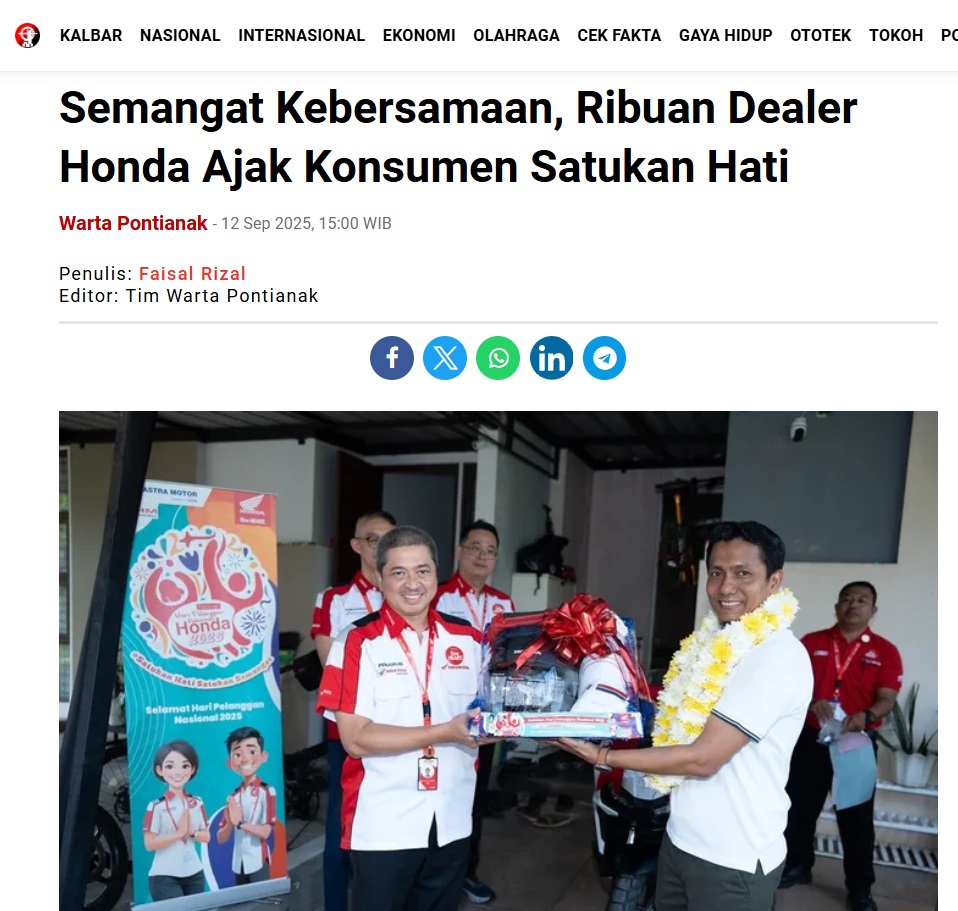 Semangat Kebersamaan, Ribuan Dealer Honda Ajak Konsumen Satukan Hati by Faisal Rizal 12 September 2025 in Silahkan kunjungi https://wartapontianak.pikiran-rakyat.com/gaya-hidup/pr-1179640391/semangat-kebersamaan-ribuan-dealer-honda-ajak-konsumen-satukan-hati. You Might Like Regional Public Launching New ADV160 The SUV Pride Grand Launching New PCX 160 Truly Exceptional! Tetap hati-hati ya bro sist berkendara saat hujan.