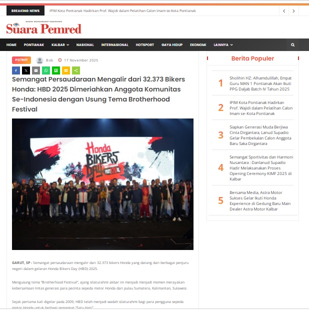 Semangat Persaudaraan Mengalir dari 32.373 Bikers Honda: HBD 2025 Dimeriahkan Anggota Komunitas Se-Indonesia dengan Usung Tema Brotherhood Festival by masmul 16 November 2025 in Silahkan kunjungi https://www.suarapemredkalbar.com/read/potret/17112025/semangat-persaudaraan-mengalir-dari-32373-bikers-honda-hbd-2025-dimeriahkan-anggota-komunitas-se-indonesia-dengan-usung-tema-brotherhood-festival. You Might Like Regional Public Launching New ADV160 The SUV Pride Grand Launching New PCX 160 Truly Exceptional! Tetap hati-hati ya bro sist berkendara saat hujan.