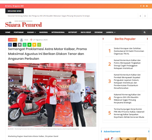 Semangat Proklamasi Astra Motor Kalbar, Promo Maksimal Agustus Ini Berikan Diskon Tenor dan Angsuran Perbulan by masmul 27 Agustus 2025 in Silahkan kunjungi https://www.suarapemredkalbar.com/read/potret/27082025/semangat-proklamasi-astra-motor-kalbar-promo-maksimal-agustus-ini-berikan-diskon-tenor-dan-angsuran-perbulan. You Might Like Regional Public Launching New ADV160 The SUV Pride Grand Launching New PCX 160 Truly Exceptional! Tetap hati-hati ya bro sist berkendara saat hujan.