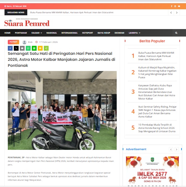 Semangat Satu Hati di Peringatan Hari Pers Nasional 2026, Astra Motor Kalbar Manjakan Jajaran Jurnalis di Pontianak by masmul 17 Februari 2026 in Silahkan kunjungi https://www.suarapemredkalbar.com/read/potret/17022026/semangat-satu-hati-di-peringatan-hari-pers-nasional-2026-astra-motor-kalbar-manjakan-jajaran-jurnalis-di-pontianak. You Might Like Regional Public Launching New ADV160 The SUV Pride Grand Launching New PCX 160 Truly Exceptional! Tetap hati-hati ya bro sist berkendara saat hujan.